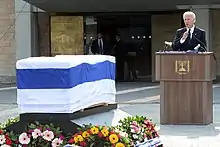 A state funeral was held on 13 January in accordance with Jewish burial customs, which require that interment takes place as soon after death as possible. Sharon's body lay in state in the Knesset Plaza on 12 January until an official state ceremony attended by dignitaries and world leaders held in the Knesset chamber on 13 January followed by burial at the family's ranch.[6][7][8] The prime minister's office issued a statement that announced public viewing 18:00 on 12 January at the Knesset Plaza. Foreign dignitaries who attended the official service included U.S. Vice President Joe Biden, former British Prime Minister Tony Blair, former Dutch Prime Minister Wim Kok, Russian Foreign Minister Sergey Lavrov, Czech Prime Minister Jiří Rusnok and German Foreign Minister Frank-Walter Steinmeier, among others.[9]