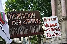 On 5 June 2013, a fight between far-left[1] and far-right activists in Paris resulted in the death of 18-year-old left-winger Clément Méric. Two right-wing skinheads, Esteban Morillo and Samuel Dufour, were indicted for his death. In September 2018, they were convicted of manslaughter and weapon supply respectively, and sentenced to 11 and 5 years in prison respectively. Morillo was freed on licence that November after an appeal, Dufour in January 2019,[2] and a second trial began in December 2019.[3] In June 2021, they were sentenced to 8 and 5 years respectively.[4]