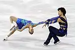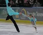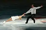 The death spiral is a figure skating term used to describe a spin involving two partners. One partner lowers the other partner while the partner getting close to the ice arches backward on one foot.[1] It was created by German professional skater Charlotte Oelschlägel and her husband Curt Newmann in the 1920s.[2] Suzanne Morrow and Wallace Diestelmeyer from Canada were the first pair team to perform the death spiral one-handed (the man holding the woman in position with one hand), at the 1948 Olympic Games.[3] In the 1960s, Soviet pair team Liudmila Belousova and Oleg Protopopov created three death spirals: "the backward-inside, forward-inside and forward-outside death spirals, which they originally named the Cosmic Spiral, Life Spiral and Love Spiral, respectively".[4]