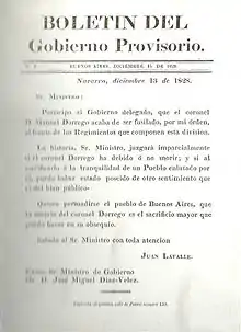 Dorrego was not sent to Buenos Aires for a trial. The unitarians Juan Cruz Varela and Salvador María del Carril wrote mails to Lavalle instructing him to execute Dorrego. Varela requested him to destroy the mails after reading them, but Lavalle kept them. Dorrego was executed in Navarro on December 13, 1828.[8][12]