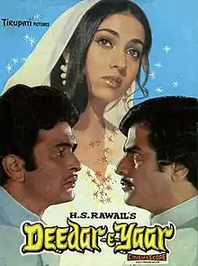 Deedar-E-Yaar is a 1982 Hindi-language romance film, produced by Prasan Kapoor under the Tirupati Pictures Enterprises banner and directed by Harnam Singh Rawail. It stars Jeetendra, Rishi Kapoor, Rekha, Tina Munim and music composed by Laxmikant-Pyarelal.