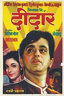 Deedar is a 1951 Hindi romantic musical film directed by Nitin Bose, starring Ashok Kumar, Nargis, Dilip Kumar and Nimmi. It is a story of unfulfilled love, where the hero's childhood love is separated from him due to class inequalities. It is one of noted tragedies made in early Hindi cinema. It became a popular film of the Golden era and further established Dilip Kumar as the "King of Tragedy".[1][2]