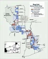 The Deep Fork National Wildlife Refuge (DFNWR) is part of the United States system of National Wildlife Refuges, and is a critical resource for wildfowl that migrate along the Central Flyway in Spring and Fall.[2] It is located in Eastern Oklahoma, near the city of Okmulgee. The preserve runs along both banks of the Deep Fork River for about 20 miles (32 km). According to TravelOK, DFNWR receives about 45,000 visitors every year.[2]