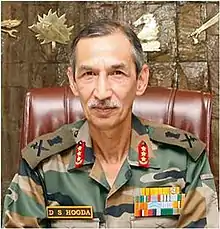 Lieutenant General Deependra Singh Hooda, PVSM, UYSM, AVSM, VSM & Bar, ADC (born 12 November 1956) is the former General Officer Commanding-in-Chief of the Indian army's Northern Command.[1] The General Officer was the Northern Army Commander during the 'surgical strike' in September 2016. He is most prominently known for his views on Kashmir with a strong emphasis on human rights. With a career spanning forty years, he has served on both the Northern and Eastern borders of India.[2]