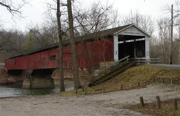 The Deer's Mill bridge was built in 1878 by J. J. Daniels and spans 275 feet (84 m) across Sugar Creek.[5] It was documented by the Historic American Engineering Record in 1974.[6]