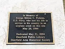 On May 26, 1944, a US Navy plane crashed in Deerfield on the current site of the Deerfield Public Library, killing Ensign Milton C. Pickens.[7] Following World War II, a portion of Waukegan Road (Route 43) that runs through Deerfield has been designated a Blue Star Memorial Highway.[8]