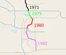 Due to its quickly rising population in the 1960s, Calgary initiated planning for the construction of an extensive freeway and expressway network that included numerous north–south and east–west routes.[52] Many of these routes were ultimately not developed into freeways, but a 1967 transportation study planned for a major north–south freeway running along the west side of the Calgary Airport across the Bow River into Inglewood, remaining west of the Bow River through present-day Fish Creek Provincial Park.[53] Initially called the Blackfoot Trail Freeway, the first segment stretched from the northern city boundary (then near Deerfoot's present-day split with Beddington Trail) to 16 Avenue NE, opening in 1971.[14] It was named after a historic route that approximated the location of present-day Memorial Drive across Nose Creek, between Barlow Trail and the community of St. George's Heights, now the location of the Calgary Zoo.[14][45] This trail appears on Calgary maps as early as 1891.[54]