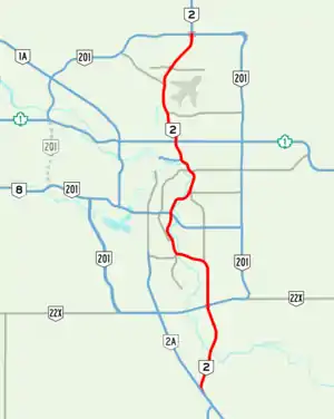 As a segment of Highway 2, Deerfoot Trail is a core route of the National Highway System and a key international corridor.[3] It is also part of Calgary's Primary Goods Movement Network and is identified as a skeletal road in the city's Transportation Plan, a limited-access route important for long distance travellers, and is the only route that stretches the entire length of the city from north to south.[4] From its split with Highway 2A (Macleod Trail) near the hamlet of De Winton in the south, it runs north to Stoney Trail at Calgary's northern city limit where it becomes the Queen Elizabeth II Highway.[5][6] The freeway roughly bisects the city, though it lies entirely east of Centre Street which officially marks the boundary between the east and west side of the city. From its southern terminus until Memorial Drive, Deerfoot approximates the course of the Bow River. Initially the freeway is on the east side, then crosses to the west bank, and finally back to the east before the river and Memorial Drive veer west at Inglewood towards downtown.[7] Most of the road's northern half parallels Nose Creek, a tributary of the Bow.[8]