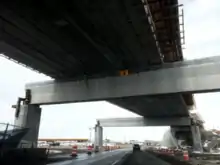 The freeway features 21 interchanges of varying design.[5] The most recent interchanges to be constructed at the north and south ends of the freeway are more consistently of the partial cloverleaf type, a design highly used in Alberta as it is a desirable compromise between cost and capacity. The two interchanges with Stoney Trail are cloverstack interchanges, where high capacity directional flyovers carry traffic turning left for movements with more traffic, and loop ramps service lesser used left turn movements.[41][42] Older and less efficient designs are used at Deerfoot's intersections with both Glenmore Trail and Highway 1. The junction with Glenmore is an incomplete cloverleaf interchange; traffic northbound on Deerfoot does not have direct access to westbound Glenmore and one must first exit to the east, proceed through a traffic light behind Calgary Auto Mall, and enter Glenmore Trail from the north side.[7] At Highway 1, a split diamond interchange significantly slows east-west traffic even outside of peak hours, because all left turn movements must pass through three sets of traffic lights.[43] This outdated interchange was Calgary's most dangerous road junction in 2011, with 234 crashes recorded.[14]