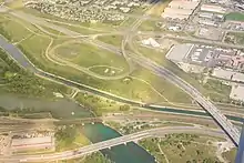 Immediately after the river, Deerfoot merges with the major routes of Anderson Road and Bow Bottom Trail, often a point of congestion at rush hour. In both directions, traffic through the outdated interchange is reduced from three lanes to two.[20] The freeway curves north along the river's west bank to cross Southland Drive, paralleling Blackfoot Trail near the community of Acadia.[7] North of Acadia, the freeway bisects a large area of commercial development for several kilometres before reaching a major interchange at Glenmore Trail.[21] The interchange is generally identified as the second of two major congestion points on Deerfoot in south Calgary, the so called "Glenmore squeeze", where traffic is reduced to two lanes each way over Glenmore.[22] Deerfoot turns sharply to the east and again crosses the Bow River on the Calf Robe Bridge, named after a Siksika Nation elder.[14] Veering back to the north, it follows the river's east bank across Peigan Trail to a partial cloverleaf interchange at 17 Avenue SE, passing the neighbourhoods of Dover and Southview. Deerfoot meets Memorial Drive, a major freeway spur into downtown, near Pearce Estate Wetland, Calgary Zoo and the Max Bell Centre, and continues into north Calgary while the Bow River turns west towards downtown.[7][23]
