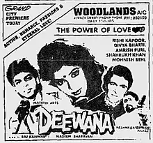 Deewana (Hindi pronunciation: [diːwaːnaː], transl. Obsessed) is a 1992 Indian Hindi-language melodrama film directed by Raj Kanwar and written by Sagar Sarhadi. It stars Rishi Kapoor, Divya Bharti and Shah Rukh Khan (in his film debut). The film revolves around an effervescent girl Kaajal (Bharti), depicting her travails as a widow after her husband Ravi (Kapoor) is killed and how her obsessive lover Raja (Khan) wins her over. Sushma Seth, Alok Nath and Amrish Puri play supporting roles.