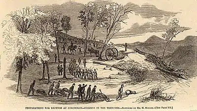 Confederate Brigadier General Henry Heth had been sent north to threaten Cincinnati, then the sixth-largest city in the United States. Heth was under orders from his superior, Major General Edmund Kirby Smith, not to attack the city, but to instead make a "demonstration".[1] Cincinnati's mayor George Hatch ordered all business closed, and Union Major General Lew Wallace declared martial law, seized sixteen steamboats and had them armed,[2] and organized the citizens of Cincinnati, Covington, and Newport, Kentucky for defense. Among the groups organized were the "Black Brigade of Cincinnati", a forcibly conscripted group of free African Americans. Although not armed, the Black Brigade was given its own flag and paid $13 for one month's service, the same pay given to privates at that time. They helped to build fortifications, including miles of military roads, breastworks, forts, and rifle pits in Kenton and Campbell counties from modern-day Fort Thomas to modern-day Bromley. Hundreds of acres of forest were cleared and in some locations used as abatis obstructions.