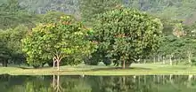 The oblong fruit, hard or fleshy, are conformed to attract animals and frequently are brightly colored with sometimes a thickened, strikingly colored stem at the junction of the peduncle part with the fruit. The fruit is black-dark and shiny, generally scarlet, but sometimes yellow or green.[5] Usually ovoid, rarely globose with a fleshy and meaty exocarp. Some species have a red or scarlet dome.[6] Seed dispersal of Dehaasia species is by vertebrates mostly. They are eaten by frugivorous bats and birds (columbiformes) and several insects such as ants.