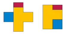 An approach very similar to the Dehn invariant can be used to determine whether two rectilinear polygons can be dissected into each other only using axis-parallel cuts and translations (rather than cuts at arbitrary angles and rotations). An invariant for this kind of dissection uses the tensor product where the left and right terms in the product represent height and width of rectangles. The invariant for any given polygon is calculated by cutting the polygon into rectangles, taking the tensor product of the height and width of each rectangle, and adding the results. Again, a dissection is possible if and only if two polygons have the same area and the same invariant. For instance, this invariant can be used to prove that a polyomino formed from a union of squares can only be dissected in this way to a square when is a square number.[20][23]