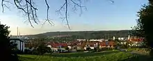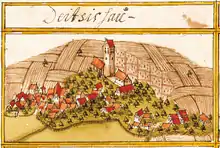 When it was settled in the 8th century, the area belonged to the Lorsch Abbey an der Bergstraße. The settlement was mentioned for the first time as Dizinsowe in a deed of the monastery Sirnau in the year 1268.[4] Back then there was the medieval castle Körschburg on the boundary of Deizisau. Their robber barons did attack the merchants on the trading road in the Neckar valley regularly. They were banished by Württemberg in 1292 and the castle was destroyed. The town itself belonged to the patrician family Bürgermeister from the free imperial city Esslingen since 1296 and did enter into the possession of the Esslinger Katharinenhospitals through purchase in the year 1411. The old church of Deizisau was broken down because of its unsafe condition in 1495. It was then replaced by today's Protestant church. Thereby the church tower which had been constructed as a fortified tower was taken over from the old church. In 1532 the Reformation was introduced in Deizisau through the Katharinenhospital.[5]