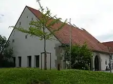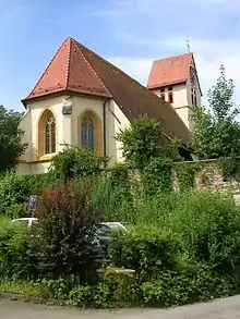According to an inscription on its gallery the late gothic church was dedicated in 1495. This date is indeed not founded on documents, but a dentochronological research in 1982 showed that the wood used for the truss was cut between 1494 and 1495. The church tower dates back from a predecessor building first mentioned in 1353.[19] Inside the church stands a Winged altarpiece from the last decade of the 15th century. The art historian Hans Rott awards it to the painter Matthias Ulin-Wolf dem Jüngeren († 1536) from Esslingen and states that until 1811 it belonged the Katharinenhospital Esslingen chapel, which was then torn down.[20] The winged altarpiece shows on the inside the saints Agnes und Saint Christopher, on the outside the motif of the emission of the apostles.[21] Moreover, worth watching are the four church windows designed by Hans Gotted von Stockhausen. The southern side window was inaugurated in 1961. The three chancel windows are from 1982.[19]