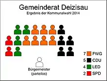 The municipal council of Deizisau has 18 members. The communal elections at the 25. May 2014 lead to the following official results:.[18] The municipal council consists of the elected honorary council members and the mayor as its chairman. The mayor is entitled to vote.