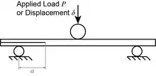 ASTM D5528 specifies the use of the double cantilever beam (DCB) specimen geometry for determining mode I interlaminar fracture toughness.[17] A double cantilever beam specimen is created by placing a non-stick film between reinforcement layers in the center of the beam before curing the polymer matrix to create an initial crack of length . During the test the specimen is loaded in tension from the end of the initial crack side of the beam opening the crack. Using the compliance method, the critical strain energy release rate is given by