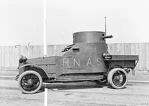 The Delaunay-Belleville armoured car was a British armoured car built on the chassis of the luxury French Delaunay-Belleville tourer. It saw service with the Royal Naval Air Service in the early years of the First World War.