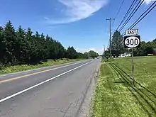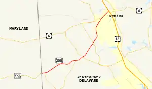 Delaware Route 300 (DE 300) is an 11.83-mile-long (19.04 km) state highway in Kent County, Delaware. The route is a continuation of Maryland Route 300 (MD 300) from the Maryland border near Everetts Corner. It runs in a northeast direction from there to the town of Smyrna, where it ends at U.S. Route 13 (US 13) while concurrent with DE 6. Along the way, DE 300 passes through rural areas as well as the towns of Kenton and Clayton. The road intersects DE 44 at Everetts Corner, DE 11 southwest of Kenton, DE 42 in Kenton, DE 15 between Kenton and Clayton, and DE 6 in Smyrna. The road was first built as a state highway in the 1920s and 1930s between the Maryland border and Clayton, with the DE 300 designation given to the road by 1936. The route was extended to its current terminus in the 1950s.