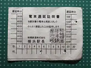 This practice is only prevalent in private and public Japanese railway companies and Germany's Deutsche Bahn.[1][2] Paris' RATP also issues such certificates under the name bulletin de retard[3] if the delay is greater than 15 minutes. They can be used, for example, for late admission at university exams.[4] In addition, a few bus companies in Japan have also adopted this practice.