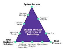The delta model can be illustrated using the strategic triangle (see fig.1). There are three points: system lock-in, best customer solutions and best product.[8] System lock- in enables market dominance and can achieve complementor share, it focuses on the entire system economics and instead of product-centered economics, which makes it very sustainable.[9] Best customer solutions need cooperation and will achieve customer share. Best product enables the company to get the edge on competition, which will increase market share.[10] These strategic points enable us to see strategic positions that show us new sources of profit.