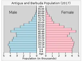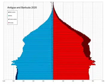 According to the 2011 census the estimated resident population of Antigua and Barbuda was 86,295.[2] The estimated population of 2018 is 96,286 (the 2019 revision of the World Population Prospects[3][4]).