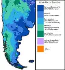 In the last national census, based on self-identification, 952,032 Argentines (2.4% of the population) declared to be Amerindians.[30] Most of the 6.2 million European immigrants arriving between 1850 and 1950, regardless of origin, settled in several regions of the country. Due to this large-scale European immigration, Argentina's population more than doubled.