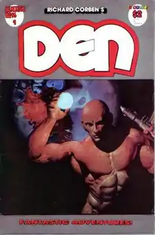 Corben created Den as the protagonist of a film short titled Neverwhere while working at Calvin Studios, an animation company in Kansas City.[1] The film is animated, with framing sequences filmed in live-action. Corben's boss at Calvin played the title character in the movie. He drew the whole animated sequence by hand in his spare time. His employers, impressed by his work, helped him to finish it by editing it and adding a new professional soundtrack with actors' voices. It was submitted to film festivals and won several awards, including the CINE Golden Eagle Award.[2] The story continued in comic form from then on. Den made his comic debut in a short comic book story that appeared in Grim Wit No.2 in September 1973. Corben expanded this short story to two parts for publication in Métal Hurlant (1975–1976). He continued the story, turning it into a 12-part serial called "Den", for the first twelve issues of Heavy Metal magazine (1977–1978). He added an epilogue, "Den's Farewell", which was printed in issue No.13 (April 1978). The original story, without the epilogue, was published in the trade paperback Neverwhere (Ariel: Feb. 1978). All 13 chapters featured in the trade paperback Den: Neverwhere (Catalan: 1984).[3]