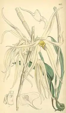 The flowers, up to four per inflorescence, are produced on very short racemes. Both leafless and leaved pseudobulbs are capable of producing an inflorescence. The flowers are up to 20 centimetres (7.9 in) across. The sepals and petals droop producing a distinctly wispy appearance.[1]