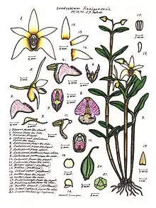 Dendrobium finniganense, commonly known as the Mount Finnigan cane orchid,[2] is a species of terrestrial or lithophytic orchid endemic to a few mountain tops in far north Queensland, Australia. It has narrow, cylindrical pseudobulbs, each with up to three thin, dark green leaves and usually only one or two white to cream-coloured flowers with yellow and purple markings near the centre.