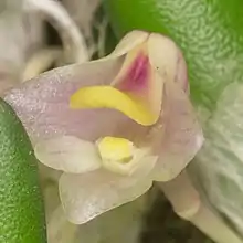 Dendrobium lichenastrum, commonly known as the common button orchid,[2] is a species of epiphytic or lithophytic orchid endemic to far north Queensland. It has a creeping, branching rhizome surrounded by papery bracts, small egg-shaped to round, fleshy, dark green leaves and a single white, cream-coloured or pink flower with red stripes and an orange labellum.