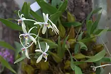 Dendrobium triflorum blooms with three to six creamy white flowers, 5 cm (2.0 in) wide, from winter to spring.[1]