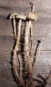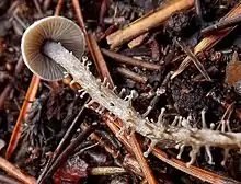 The stem is 4 to 6 cm (1.6 to 2.4 in) long by 1 mm thick, roughly equal in width throughout, and tapers to a long "root" which terminates in a dull black, roughly spherical sclerotium.[14] The stem may be buried deeply in its substrate.[13] The stem surface is roughly the same color as the cap, with a fine whitish powder on the upper surface. In the lower portion, the stem is brownish, and has fine grooves that run lengthwise up and down the surface.[15] The lower half is covered with irregularly arranged short branch-like protuberances at right angles to the stem that measure 2–3 by 0.5 mm. These projections are cylindrical and tapering, with ends that are covered with a slime head of conidia (fungal spores produced asexually). D. racemosa is the only mushroom species known that forms conidia on side branches of the stem.[16] The sclerotium from which the stem arises is watery grayish and homogeneous in cross section (not divided into internal chambers), with a thin dull black outer coat, and measures 3 to 6 mm (0.12 to 0.24 in) in diameter.[14] American mycologist Alexander H. Smith cautioned that novice collectors will typically miss the sclerotium the first time they find the species.[17] The edibility of D. racemosa is unknown,[17] but as David Arora says, the fruit bodies are "much too puny and rare to be of value."[10]