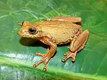 In a sample from Chocó, three adult males measure 25–26 mm (0.98–1.02 in) and an adult female measures 31 mm (1.2 in) in snout–vent length (SVL).[7] In a sample of 11 adults (no sex specified), including the holotype, SVL varied between 31 and 34 mm (1.2 and 1.3 in).[3] The snout is short and rounded. The tympanum is very indistinct. The fingers are webbed at the base, whereas the toes are slightly more than one-half webbed.[3] Coloration is sexually dimorphic: males have dull yellowish green dorsal surfaces of body and limbs, while these are pale golden brown or beige in females. The concealed surfaces of the limbs are bright orange. The throat bright yellow and the belly and posteroventral part of flanks are pale brownish yellow. The iris is coppery.[6]