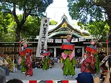 A new style developed, and has been called fūryū dengaku.[1] Fūryū is a generic term for the processions that developed during the second half of the Heian period, when catastrophes repeatedly struck Kyoto and its environs. Processions were organized to placate the deities, demons, and ghosts thought responsible, characterized by the colorful costumes worn by the performers and the loud music. Dengaku was adopted by some of the most powerful shrines in Kyoto and came to be regularly performed at the goryō-e (one of the capital's main festivals and meant to appease agitated spirits).[1] The original dengaku of the rice fields continued to flourish in rural society and in fact still survives in many agricultural areas.