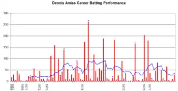 Amiss was also a handy One Day International batsman scoring 859 runs, including four centuries and one half-century, with a top score of 137 against India which is still England's fourth highest individual score in the Cricket World Cup, behind the 158 scored by Andrew Strauss against India in 2011, Jason Roy's 153 against Bangladesh in 2019, and Eoin Morgan's 148 against Afghanistan at the same tournament.[5] He has the distinction of scoring the first ever One Day International century (103 in only the second One Day International on 24 August 1972) which is also the first instance of a debutant scoring a century in ODI. Amiss along with Keith Fletcher is also credited to have shared the first ever partnership of hundred runs in the same match.[6][7] He ended with an ODI batting average of 47.72, which excepting those players to have played fewer than five times, remains the highest of any England batsman who has completed his career. The still-active Kevin Pietersen averaged over 50 throughout the first 60 matches of his ODI career up until September 2007, but that figure had fallen to under 41 by June 2011.