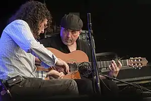 In the late 1980s he and Irish fiddler Martin Hayes formed a band in Chicago called Midnight Court which combined traditional music with rock and roll.[3] The band, in which Cahill played a Fender Telecaster and Hayes an electric fiddle, was active between 1989 and 1992. After its demise Cahill and Hayes continued to work together and formed an acoustic duo in 1996, developing an "unrushed, lyrical, highly expressive interpretation" of traditional Irish music.[4] Cahill's chordal accompaniment uses standard tuning.[5]
