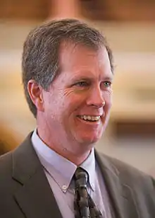 Dennis McKinney (born July 24, 1960) is a former Kansas State Treasurer. He was a member of the Kansas House of Representatives where he represented the 116th House District for ten terms, the last six as the Democratic Party's leader (Minority Leader) in the Kansas House. In January 2017, he was a Democratic candidate for the party's nomination as the 4th District of Kansas nominee in the U.S. House of Representatives. At the Democrats' 4th District nominating convention February 10, 2017, he narrowly lost to James Thompson.