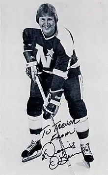 O'Brien was selected by the Minnesota North Stars in the second round, 14th overall, of the 1969 NHL Amateur Draft, and played for the North Stars for the majority of his career, from 1970–71 to 1977–78. During his final season with the North Stars, he played just 13 games before being traded to the Colorado Rockies. After 16 games with the Rockies, he was traded to the Cleveland Barons and after 23 games as a Baron, he was traded to his fourth team of the season, the Boston Bruins, where he played 16 games. The final trade to the Bruins broke an NHL record for the most teams played for in one season.[1] That record has since been equalled by Dave McLlwain in 1991–92, Mark Arcobello in 2014-15 and Jussi Jokinen in 2017-18.