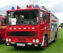The first of the Dennis RS/SS fire appliances were fitted with Perkins V8 diesel engines, either the V8-540 or the V8-640, with or without turbochargers; by 1987, the RS and SS could be specified with Cummins C-series engines.[1][3] Early appliances were bodied in-house by Dennis at their Woodbridge factory, but when in-house fire engine bodying was discontinued in 1985, the bodying of the Dennis RS/SS series and derivative products was outsourced to other coachbuilders, primarily to Carmichael Fire.[4] The RS could also be fitted with a variety of bodies by other coachbuilders including HCB Angus,[5] Fulton Wylie and Saxon Specialist Vehicles.