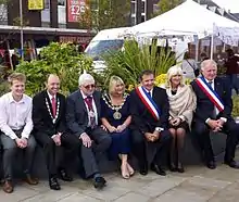 On 5 December 1992, Denton became a twin-town to Montigny le Bretonneux, near Paris, France. On one side of the town hall, there is a 'French road sign' which was a gift from the Municipal Authority in Montigny and states how far it is to Montigny le Bretonneux from Denton. There is a similar 'English road sign' outside Montigny's Town Hall pointing to Denton. Denton celebrated 20 years of twinning in September 2012.