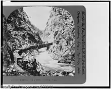 The Denver, South Park, and Pacific Railroad (later called the Denver, Leadville and Gunnison Railway) was a historic 3 ft (914 mm) narrow gauge railroad that operated in Colorado in the western United States in the late 19th century. The railroad opened up the first rail routes to a large section of the central Colorado mining district in the decades of the mineral boom. The railroad took its name from the fact that its main line from Denver ascended the Platte Canyon and traversed South Park. Founded in 1872 by Colorado Governor John Evans, the company was purchased by the Union Pacific Railway in 1880, though it continued to be operated independently.[1][2] The line went bankrupt in 1889 and was reorganized under the new moniker the Denver, Leadville and Gunnison Railway.[2] When the Union Pacific went bankrupt in 1893, the DL&G lines went into receivership and were eventually sold to the Colorado and Southern Railway.[1] In the first half of the 20th century, nearly all the company's original lines were dismantled or converted into 4 ft 8+1⁄2 in (1,435 mm) standard gauge. The last train to run the old DSP&P tracks was from Como, Colorado on April 11, 1937. A section of the standard gauge line between Leadville and Climax is still operated as a passenger excursion railroad called the Leadville, Colorado and Southern Railroad. At its peak the Denver, South Park and Pacific Railroad had 335 miles (539 km) of narrow gauge line, making it the largest narrow gauge railroad in the state of Colorado.[2]