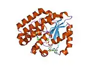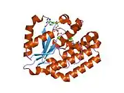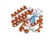 Deoxycytidine kinase (dCK) is an enzyme which is encoded by the DCK gene in humans.[5] dCK predominantly phosphorylates deoxycytidine (dC) and converts dC into deoxycytidine monophosphate. dCK catalyzes one of the initial steps in the nucleoside salvage pathway[6] and has the potential to phosphorylate other preformed nucleosides, specifically deoxyadenosine (dA) and deoxyguanosine (dG), and convert them into their monophosphate forms.[7] There has been recent biomedical research interest in investigating dCK's potential as a therapeutic target for different types of cancer.[6][7][8]
