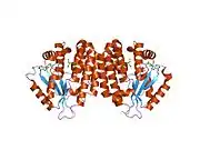 dCK is a homodimer where each monomer subunit consists of multiple alpha helices surrounding a beta sheet core.[9][7][10] Each subunit includes a nucleotide donor binding site, nucleoside acceptor binding site, nucleotide base sensing loop (240-254 residues), insert region (12-15 residues) that connects helices 2 and 3.[9][10] dCK has several different protein conformations but its conformation depends on the nucleoside or nucleotide it binds to. dCK can bind to ADP, ATP, UDP or UTP (phosphoryl group donors) but UDP/UTP binding changes the enzyme's conformation by rearranging the nucleotide base sensing loop as compared to the dCK's conformation when bound to ATP. This change in conformation when a specific phosphoryl donor is bound in the nucleotide binding site determines which nucleoside can bind in the nucleoside binding site.[9][10] For example, it has been observed that when dCK binds to ADP, dCK takes on a "closed" conformation or more compact nucleoside binding site where glutamic acid 53 (Glu53) is brought into closer proximity to directly interact with the nucleoside's 5' hydroxyl group.[9][10]