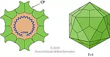 Dependoparvoviruses have an icosahedral shape, measure 22 nm[4] is composed of 60 wedge-shaped proteins triangulation number = 1). Three proteins (VP1, VP2 and VP3) are present in each capsomere. Each capsid is made from 5 VP1, 5 VP2, and 50 VP3 proteins. The capsid does not have an envelope.[5]