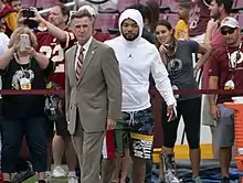 Predicted as a first round pick before the draft, Guice reportedly had his draft stock fall due to questions about his character and other incidents during the drafting process, such as an alleged verbal altercation between himself and Howie Roseman, executive of the Philadelphia Eagles.[21][22] Roseman and other Eagles personnel denied it took place, with Guice stating that the incident, as well as other rumors of him being lazy, immature, and dishonest, were not true.[21][22][23][24] Another issue allegedly occurred at the NFL Combine, where Guice claimed that he was asked if he liked men during an interview with a team, as well as if his mother "sells herself".[25] The NFL later investigated the claims, but found no proof it had happened.[26] Guice was eventually drafted in the second round, 59th overall, by the Washington Redskins.[27][28] On May 10, 2018, Guice signed a four-year, US$4.54 million contract with the team.[29] In the first preseason game of his rookie year, Guice sustained a torn ACL, which ended his season.[30]
