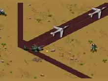 Desert Strike is a shoot 'em up game in which the player pilots an AH-64 Apache helicopter (albeit modified with a Fenestron rotor). The game is less frantic than typical shoot 'em ups, with the addition of greater strategic elements.[2] The action takes place on open, multi-directional scrolling levels viewed from an isometric perspective.[3] The player views the action from outside the helicopter, rather than from within the cockpit.[4] The player is also assisted by their copilot, who they can pick at the start of the mission; each copilot plays differently with different skill levels. The best copilot, Lt. Carlos "Jake" Valdez, is missing in action at the start of the game, and can be found and rescued during one of the missions.[5]