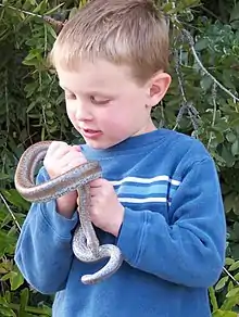 The desert rosy boa is extremely docile when encountered by humans. When disturbed, it usually rolls into a compact ball with the head in the center.[8] The species is not prone to bite in defense, but rather will release a foul-smelling musk from the base of the tail when threatened. When human bites have occurred, they have usually been the result of a feeding response with a captive animal. The desert rosy boa is nonvenomous. Its extreme docility, few needs, and attractive coloration have made the desert rosy boa popular with herpetoculturists.