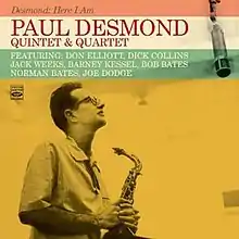 Desmond: Here I AM is a jazz compilation album issued by the Fresh Sound label in 2015.[1] It contains the first two record releases of alto saxophonist Paul Desmond as a leader: Paul Desmond Quintet with The Bill Bates Singers, a 10-inch vinyl record from 1954,[2] and Paul Desmond Quartet Featuring Don Elliott, a 12-inch from 1956,[2] both originally released on the label Fantasy Records.[3]